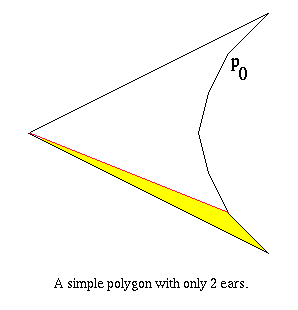 The start vertex for FindEar is p0. If the vertices are sorted in clockwise order, the ear shown in yellow is the first ear found. The number of vertices checked in order to find this ear is n - 2 (where n is the number of vertices in P).