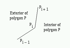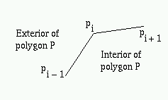 A vertex pi is concave if a left turn is made at pi while going from pi-1 to pi+1 where the interior of the simple polygon P is to the right (ie. P is being traversed in clockwise order).