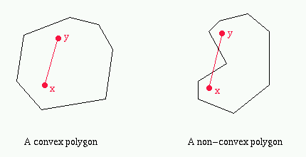 A polygon P is convex if and only if for any pair of points x, y in P the line segment between x and y lies entirely in P.