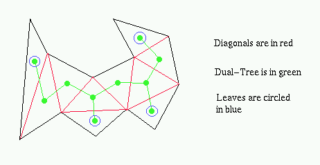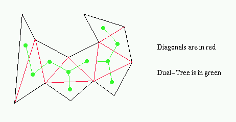 Given a triangulated simple polygon, the dual-tree is the graph generated by plotting a vertex at each triangle and edges joining vertices in adjacent triangles (triangles which share a diagonal).