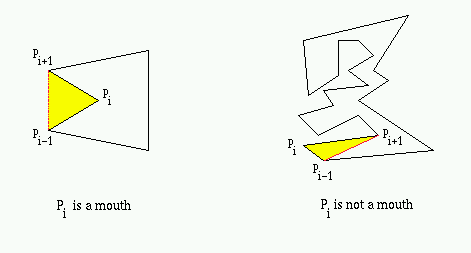 A principal vertex pi of a simple polygon P is called a mouth if the diagonal (pi-1, pi+1) is an external diagonal, i.e., the interior of (pi-1, pi+1) lies in the exterior of P [7].