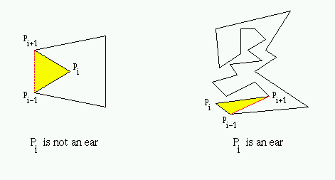 A principal vertex pi of a simple polygon P is called an ear if the diagonal (pi-1, pi+1) that bridges pi lies entirely in P. We say that two ears pi and pj are non-overlapping if the interior of triangle (pi-1, pi, pi+1) does not intersect the interior of triangle (pj-1, pj, pj+1) [4].