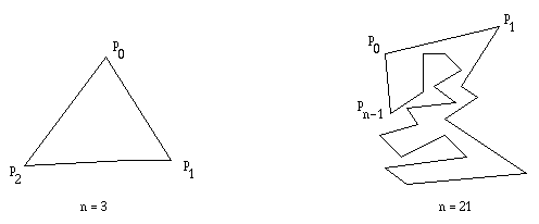 A polygon is a closed chain of n line segments (pi, pi+1) for 0 <= i <= n-1 and (pn-1, p0) , where n >= 3. The polygon P is represented by its vertices P = (p0, p1,..., pn-1).