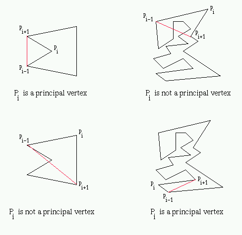 A vertex pi is called a principal vertex if the diagonal (pi-1, pi+1) intersects the boundary of simple polygon P only at pi-1 and pi+1 [5].
