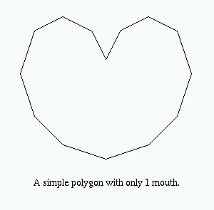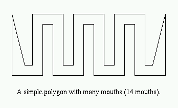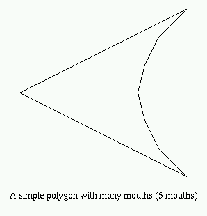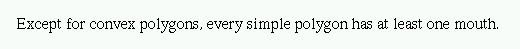 Construct the convex hull CH(P) where P is a non-convex simple polygon. Since P is non-convex there must exist edges on the boundary bd(CH(P)) that are not edges of P. Each such edge forms the "lid" of a "pocket" of CH(P). We shall prove that in fact every such pocket yields a mouth. Let Kij denote the pocket of CH(P) determined by vertices pi and pj of P. Kij = {pi, pi+1, ..., pj} U {pj, pi} forms itself a simple polygon. By the Two-Ears Theorem Kij must have two ears and since they are non-overlapping they cannot both occur at pi and pj. Therefore, at least one ear must occur at pk for i < k < j. Obviously such an ear for Kij is a mouth for P.